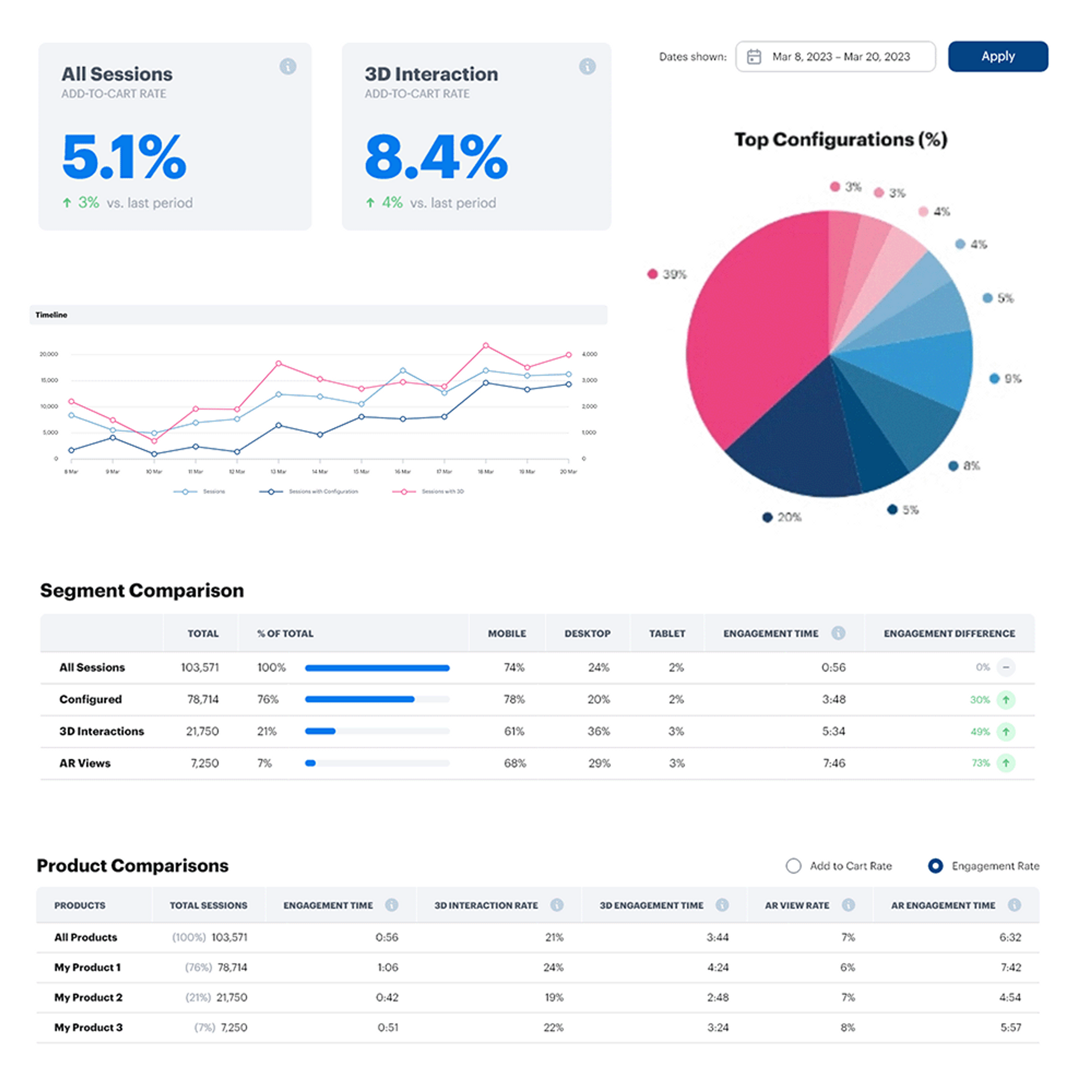 Gain crucial insights into your buyers’ behaviors with data illustating what configurations are most commonly chosen, how users interact with your 3D products, and where the next opportunity lies.