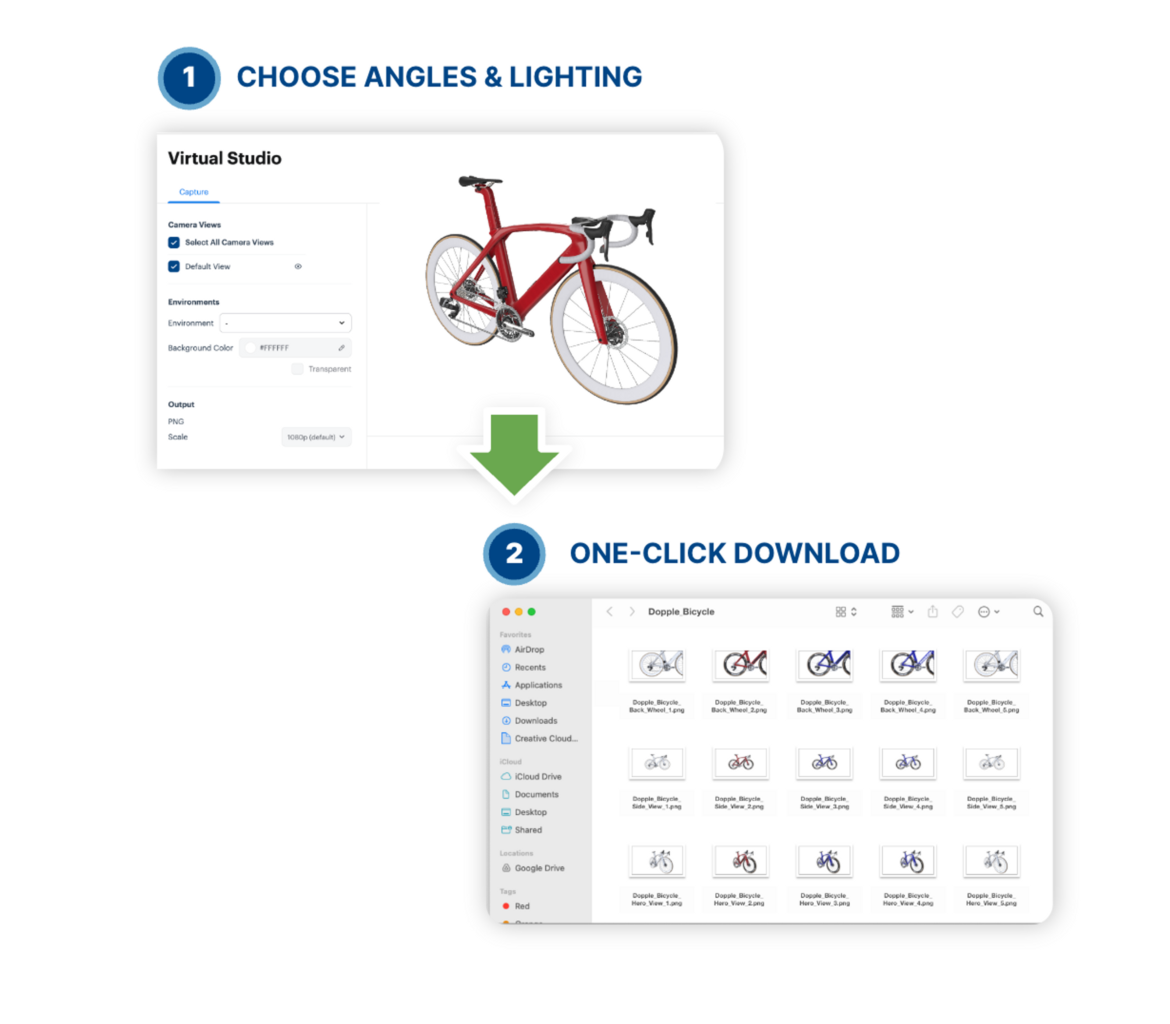 Dopple includes a built-in snapshot feature, giving your customers (and your teams) the ability to save high quality product images for side-by-side comparisons, social sharing, or marketing assets.